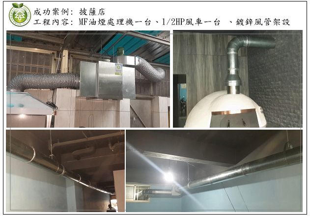 小松環保於台南市南台街 披薩店,裝設一式MF型餐飲業油煙/異味處理設備,包括MF油煙處理機一台、白鐵煙罩2只、2HP風車一台,MF型相當於靜電機的效果,油煙去除效率90%以上,異味去除效率30%-50% ,適用於中低油煙或油煙粒徑較大,且低異味的餐飲業者。