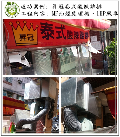 小松環保於新北市樹林區 昇冠泰式酸辣雞排,裝設一式餐飲業油煙/異味處理設備,包括MF型油煙煙處理機、1HP風車,MF型相當於靜電機的效果,油煙去除效率90%以上,異味去除效率30%-50% ,適用於中低油煙或油煙粒徑較大,且低異味的餐飲業者。